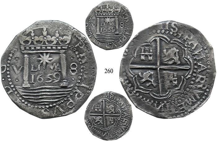 Lima, Peru, cob 8 reales presentation strike, 1659V, "Star of Lima," rare, finest known. S-L5. 26.9 grams. By all accounts this is the finest known specimen of this rare, unauthorized issue, in fact believed to be THE coin that was intended for presentation to the king to show off the new minting and ask for approval (which never came). The immense crown above the pillars is beautifully detailed, and the •V•, *-LIMA-1659, •8• are equally impressively well struck above the 100% full waves, with most of the king's name PHILIPPVS visible in the legend, also with perfect lions and castles inside the cross on other side, whose bold legend shows reversed N's. Save for a touch of corrosion, this coin is undeniably Mint State, beautifully toned and worthy of the best collections. Recovered from: San Miguel el Arcangel ("Jupiter wreck"), sunk in 1659 off the east coast of Florida.