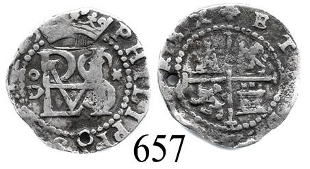 Lima, Peru, cob ½ real, Philip II, assayer Diego de la Torre, oD to left, * to right. S-L4. 1.6 grams. Bold full PHILIPPVS in legend, nice full monogram and cross, nearly full crown, VF with toned fields, tiny hole at very edge.