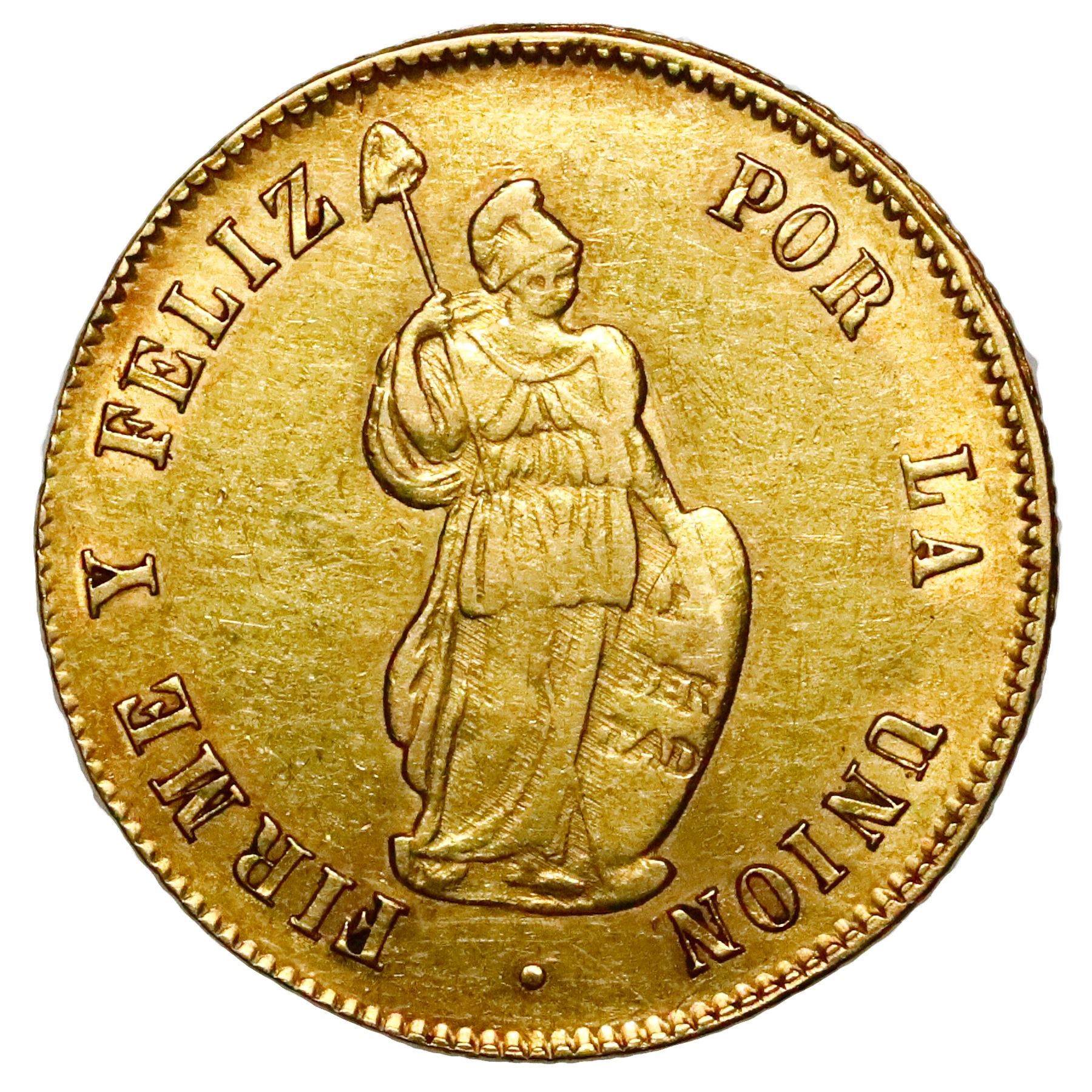 Lima, Peru, gold 2 escudos, 1853MB. KM-149.2. 6.74 grams. About XF with surface hairlines, rose-gold toning around the edges.