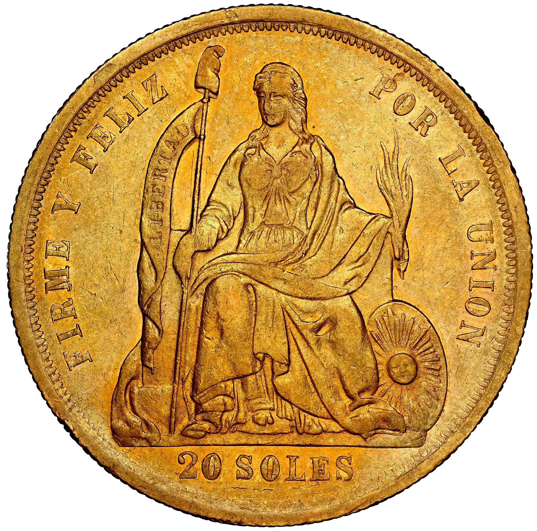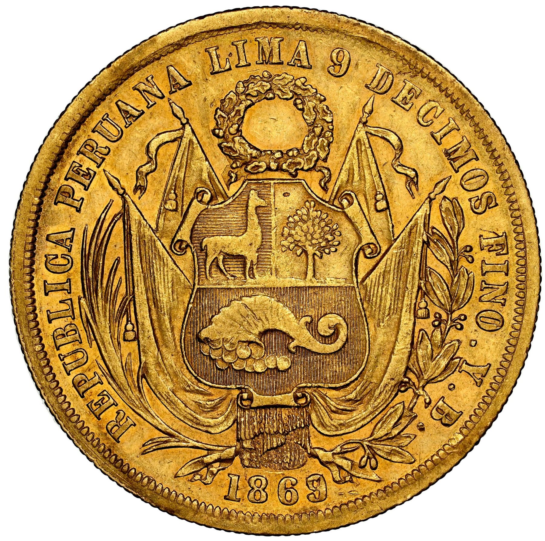 Lima, Peru, gold 20 soles, 1869/3 YB, NGC AU 55. KM-unl (194 for type); Fr-unl (70 for type). Struck from identical dies as the 1863 in the previous lot but with the last digit over-punched with a 9 (traces of the 3 still visible), once believed to be an error, as stated in the only reference to mention it (La Amonedacion En Oro De Las Cecas De Lima, Cuzco Y Potosi, by Pedro E. de la Puente Jeri [1994], "Error de cuno, es un ejemplar de 1863 con una falla que da la impresion que apareciera un 9 en vez de un 3"), but now known for certain to be a legitimate overdate and in fact represented by three pieces, the other two being an example permanently impounded in the Banco de Peru and an NGC MS 62 in private hands (previously sold as PCGS AU58, admittedly higher grade but with egregious flaws around the head of Liberty). (Note that NGC refers to both that coin and this one as 1863/9 for unknown reasons.) Further research shows that the Lima mint report (cuenta de hacienda) for 1869 mentions a small amount of gold minted (in addition to plenty of silver) but does not specify the denomination. The present example shows ample luster in a rich gold color, with minor bagmarks on both sides, an attractive piece and an incredible opportunity for the Peruvian specialist or trophy collector.