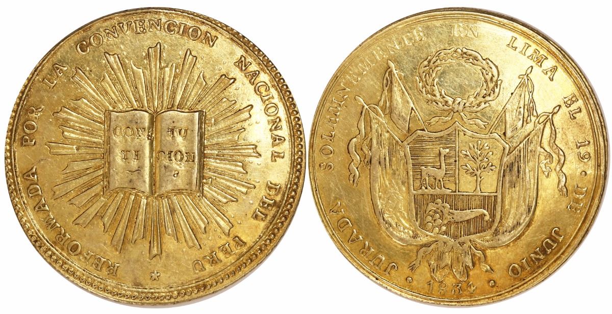 Lima, Peru, gold 8E-sized proclamation medal, 1834, Constitution, very rare. Ex-Eliasberg. 24.95 grams, 35mm. Obverse with Constitution (book) on rays inside legend * REFORMADA POR LA CONVENCION NACIONAL DEL PERU; reverse with national arms inside legend JURADA SOLEMNEMENTE EN LIMA EL 19 • DE JUNIO with date • 1834 • at bottom. Lightly polished XF, excellent pedigree, only specimen we could find record of in this metal. Pedigreed to the Eliasberg collection (ANR auction of April 2005, lot #3546).