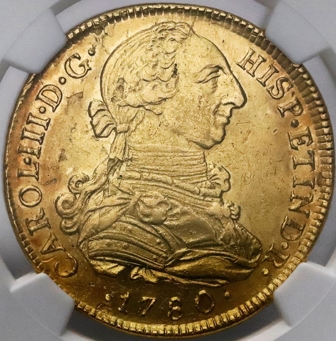 Lima, Peru, gold bust 8 escudos, Charles III, 1780MI, NGC AU details / cleaned. Cal-1942; KM-82.1. Bold details and bright surfaces, faint wipe in front of bust. NGC #5939653-005.
