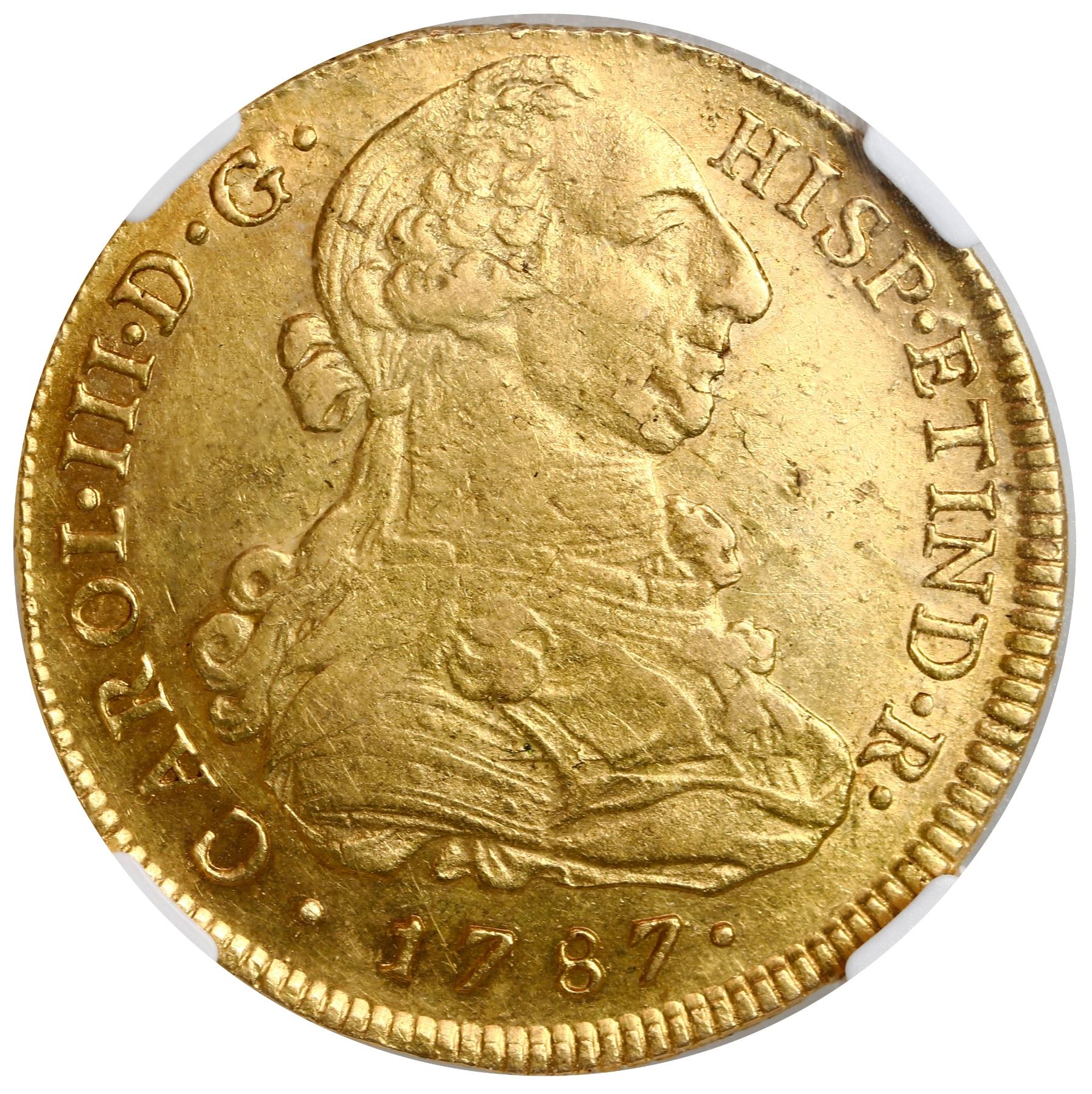 Lima, Peru, gold bust 8 escudos, Charles III, 1787 IJ, NGC AU 58 ("top pop"). KM-82.1a; Cal-1952; Fr-32. Lustrous example of the scarcer of two assayers for this date, a bit weakly struck on the bust with a few lamination flaws but otherwise bright and well detailed, tied with one other for finest known in the NGC census. Please use this link to verify the certification number