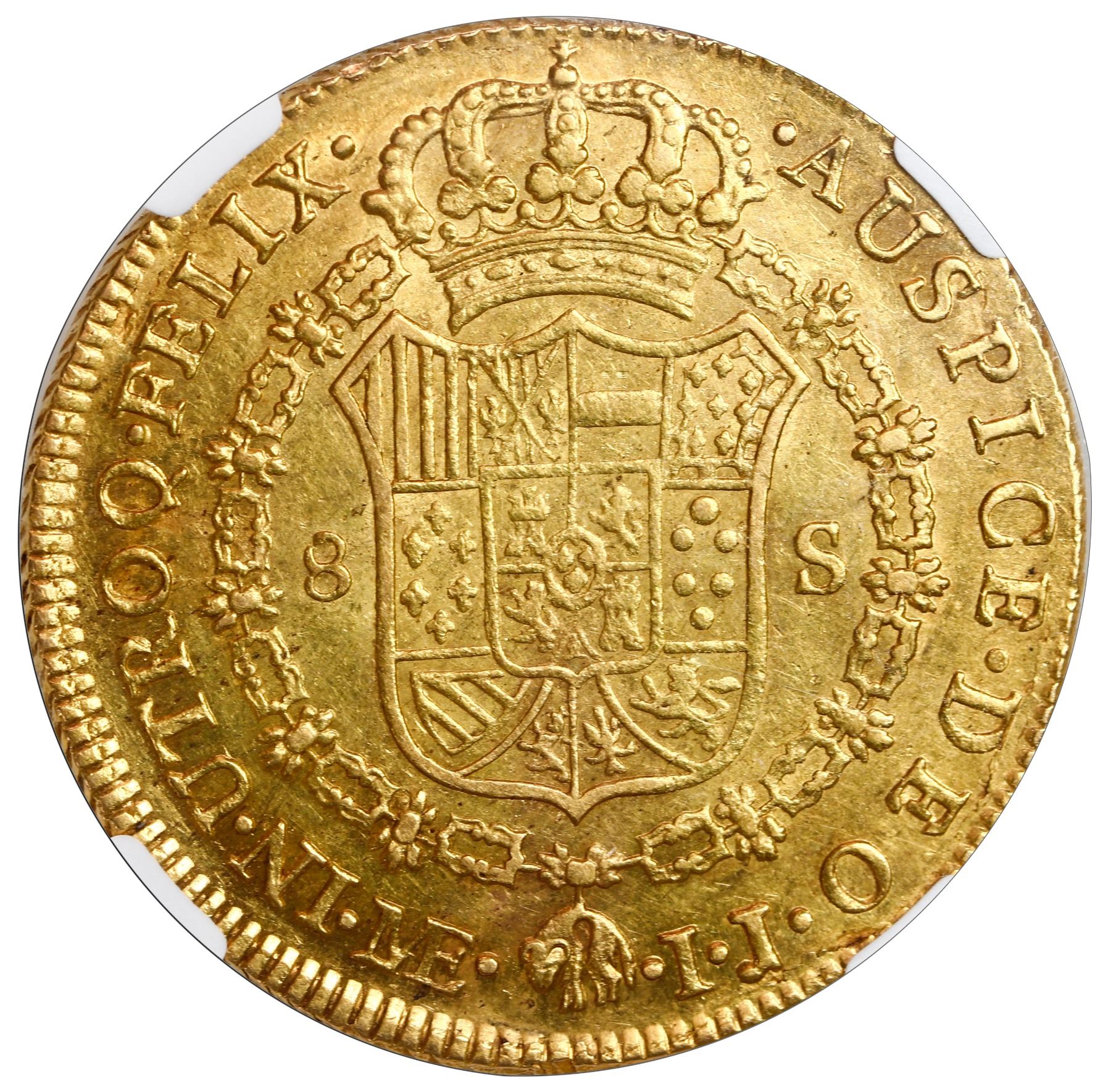 Lima, Peru, gold bust 8 escudos, Charles III, 1787 IJ, NGC AU 58 ("top pop").