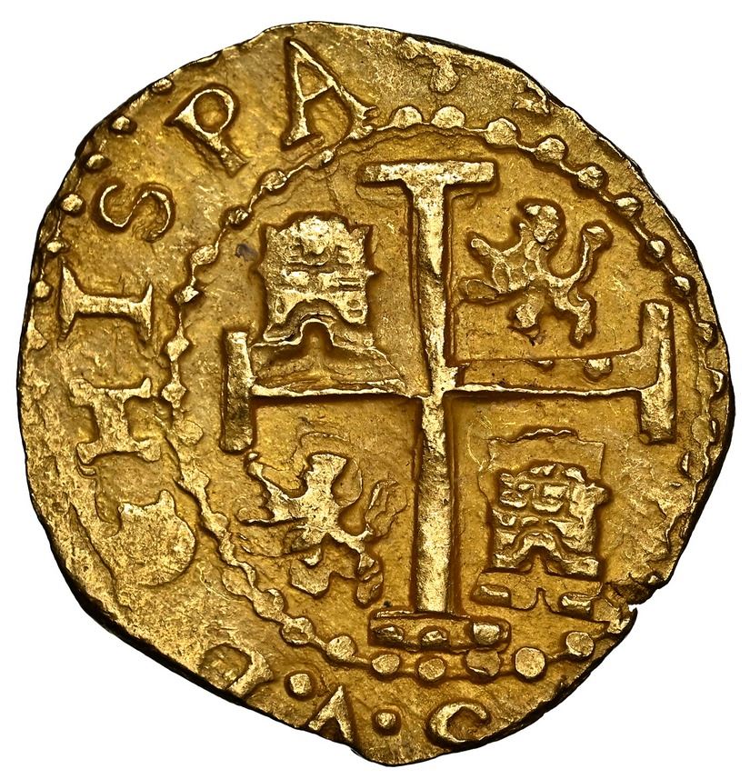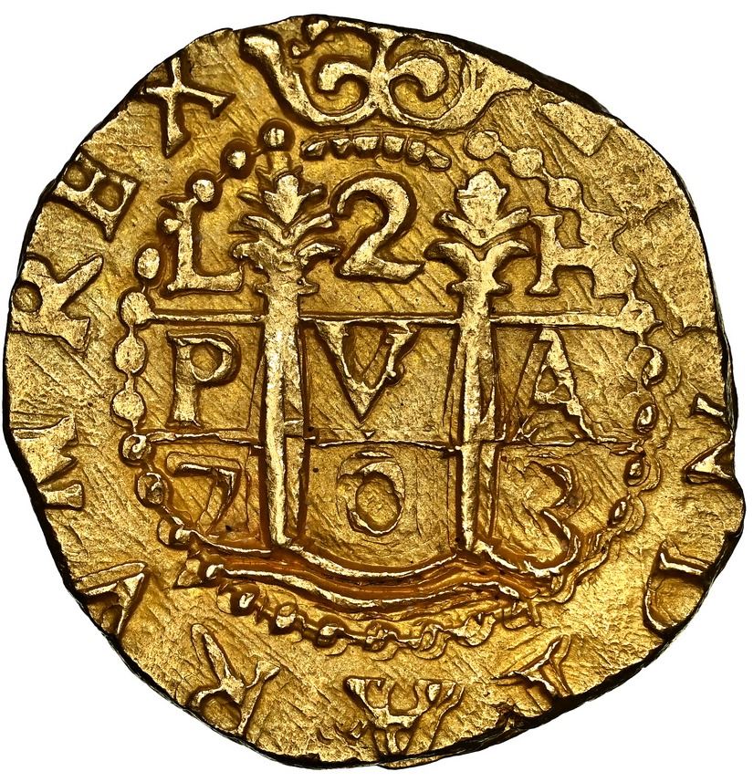 Lima, Peru, gold cob 2 escudos, 1703 H, NGC MS 65 (1715 Fleet Shipwreck Label, "top pop").