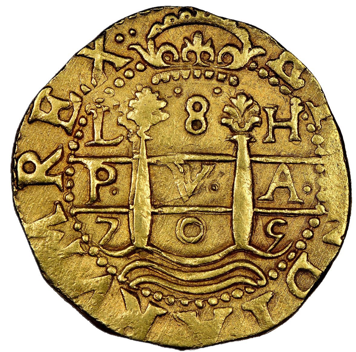 Lima, Peru, gold cob 8 escudos, 1705 H, NGC AU 58 (1715 Fleet Shipwreck Label), Tauler Plate. S-L25a; KM-38.1; Cal-2112. 26.96 grams. Choice and well-centered full pillars-and-waves and cross-lions-castles, nearly full legends, no doubling or damage, with very light toning on fields, desirable Plate Coin. From the 1715 Fleet, with Sedwick photo-certificate, Plate Coin 224 on page 498 of Tauler's Oro Macuquino (2011).
