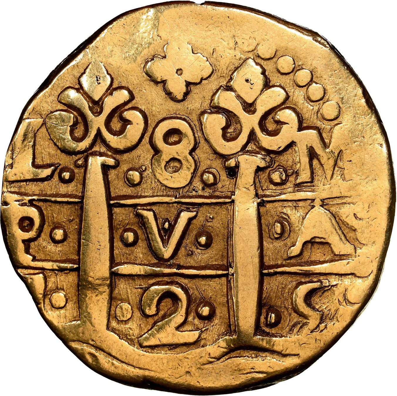 Lima, Peru, gold cob 8 escudos, 1725 M, (Louis I), rare, NGC XF details / removed from jewelry.