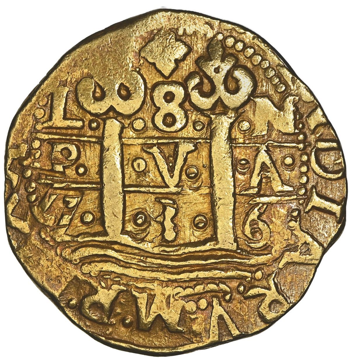 Lima, Peru, gold cob 8 escudos, 1736 N, NGC AU details / mount removed.