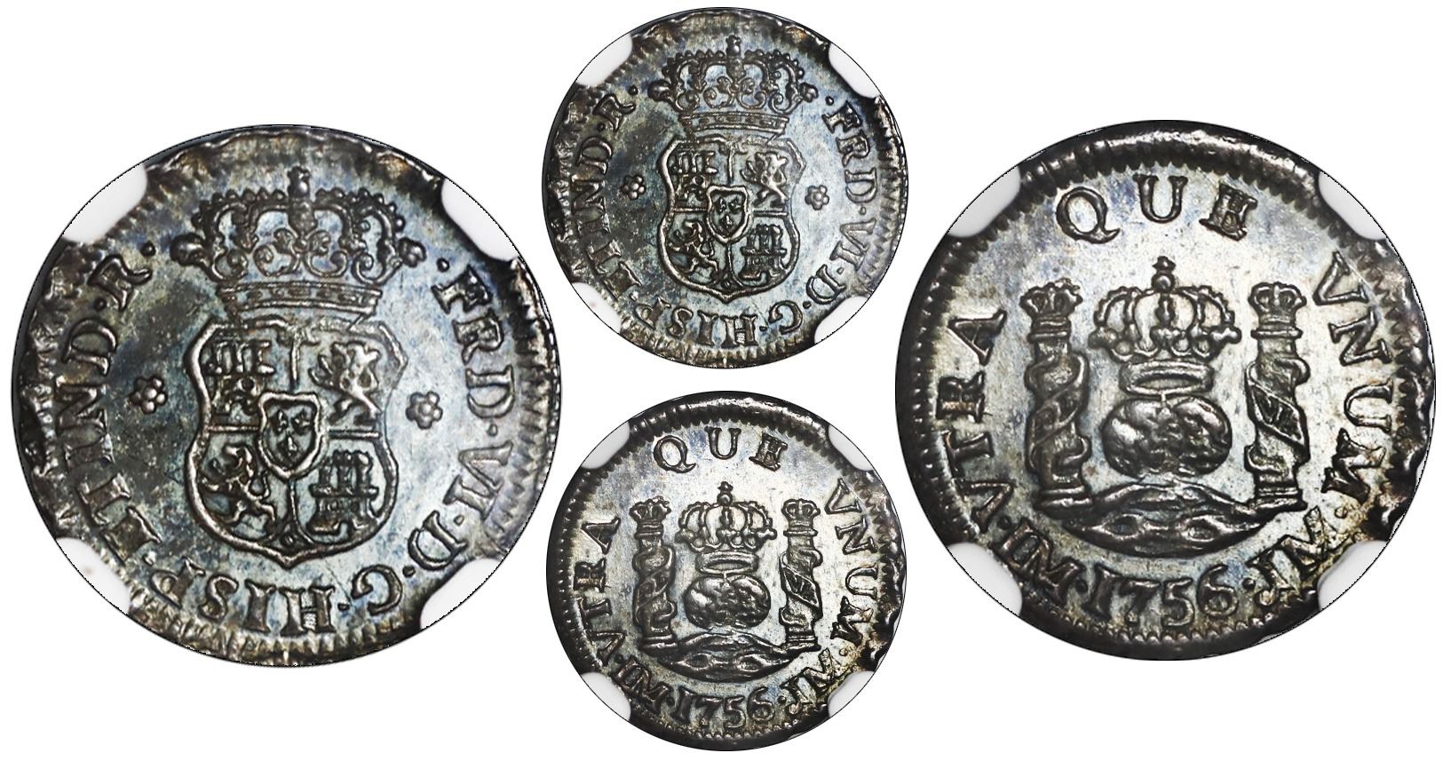 Lima, Peru, pillar 1/2 real, Ferdinand VI, 1756JM, no dot over mintmark, NGC MS 63, "top pop." Yonaka-L05-56; Cal-58; KM-51. Deep aqua-blue toning over luster, nice strike with virtually no marks or wear, broad flan with slightly crude rims (as made), tied with two others for finest known in NGC census. NGC #2056660-193.