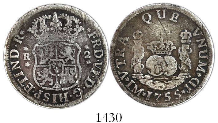 Lima, Peru, pillar 2 reales, Ferdinand VI, 1755JD, dot over mintmark. KM-53. 6.36 grams. Scarce variety, nicely toned Fine with scratches and scrapes.