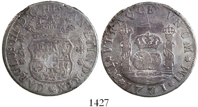 Lima, Peru, pillar 4 reales, Charles III, 1771JM. KM-63; CT-1079. 13.05 grams. Lightly rainbow-toned AVF (somewhat softly struck) with underlying luster, some scratches, parts of edge corroded.