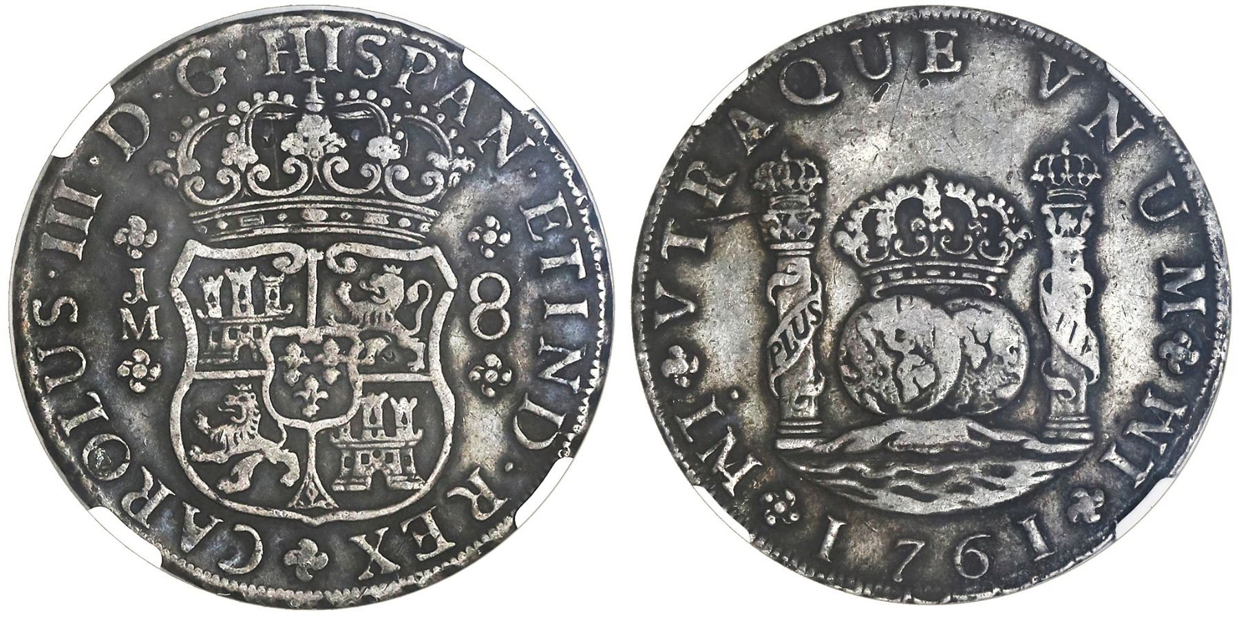Lima, Peru, pillar 8 reales, Charles III, 1761JM, dot over left mintmark only, NGC VF details / chopmarked. KM-A64.2; CT-836. Deeply toned (darker around details), the light wear on high points rather inoffensive (could pass for XF), with just two or three tiny chops on shield side. NGC #4825029-004.