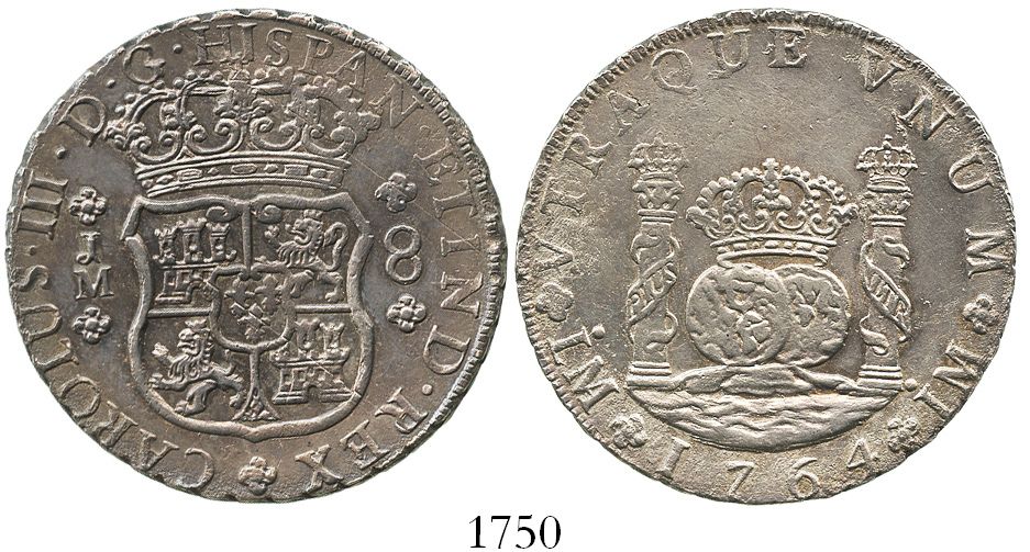 Lima, Peru, pillar 8 reales, Charles III, 1764JM, dot over both mintmarks. KM-A64.1; CT-840. 26.6 grams. AU+ with touch of corrosion at rim, hairline scratch across crown, faint colorful toning.