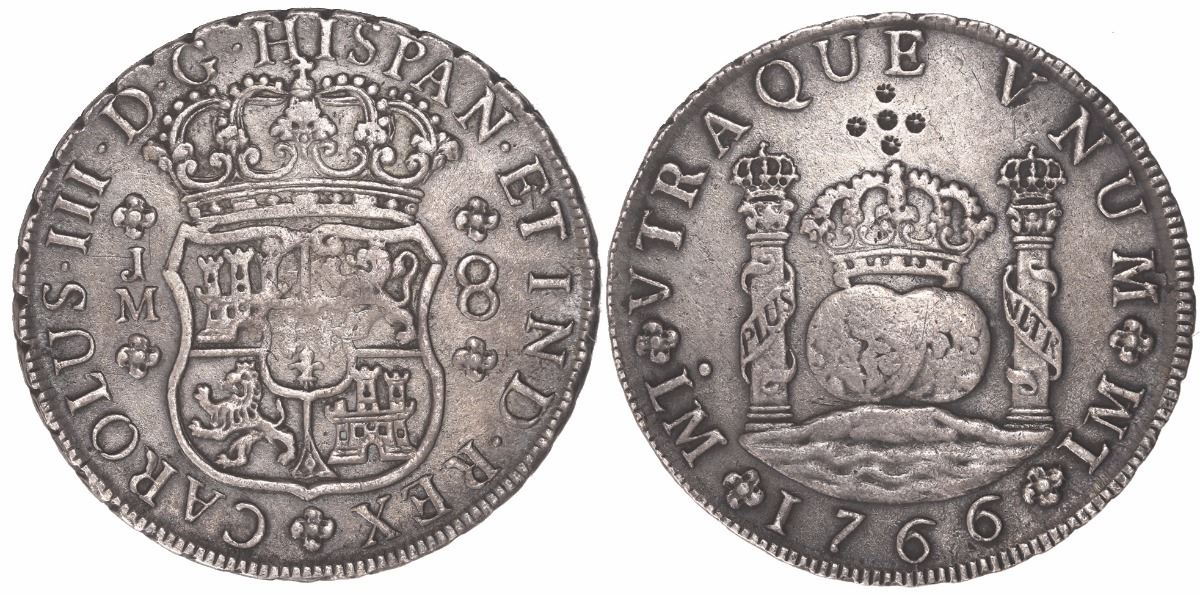 Lima, Peru, pillar 8 reales, Charles III, 1766JM, dot over left mintmark only.