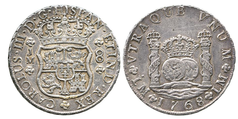 Lima, Peru, pillar 8 reales, Charles III, 1768JM, dot over left mintmark only.