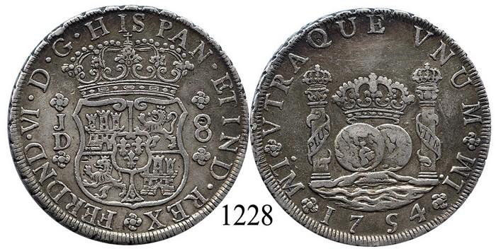 Lima, Peru, pillar 8 reales, Ferdinand VI, 1754JD.