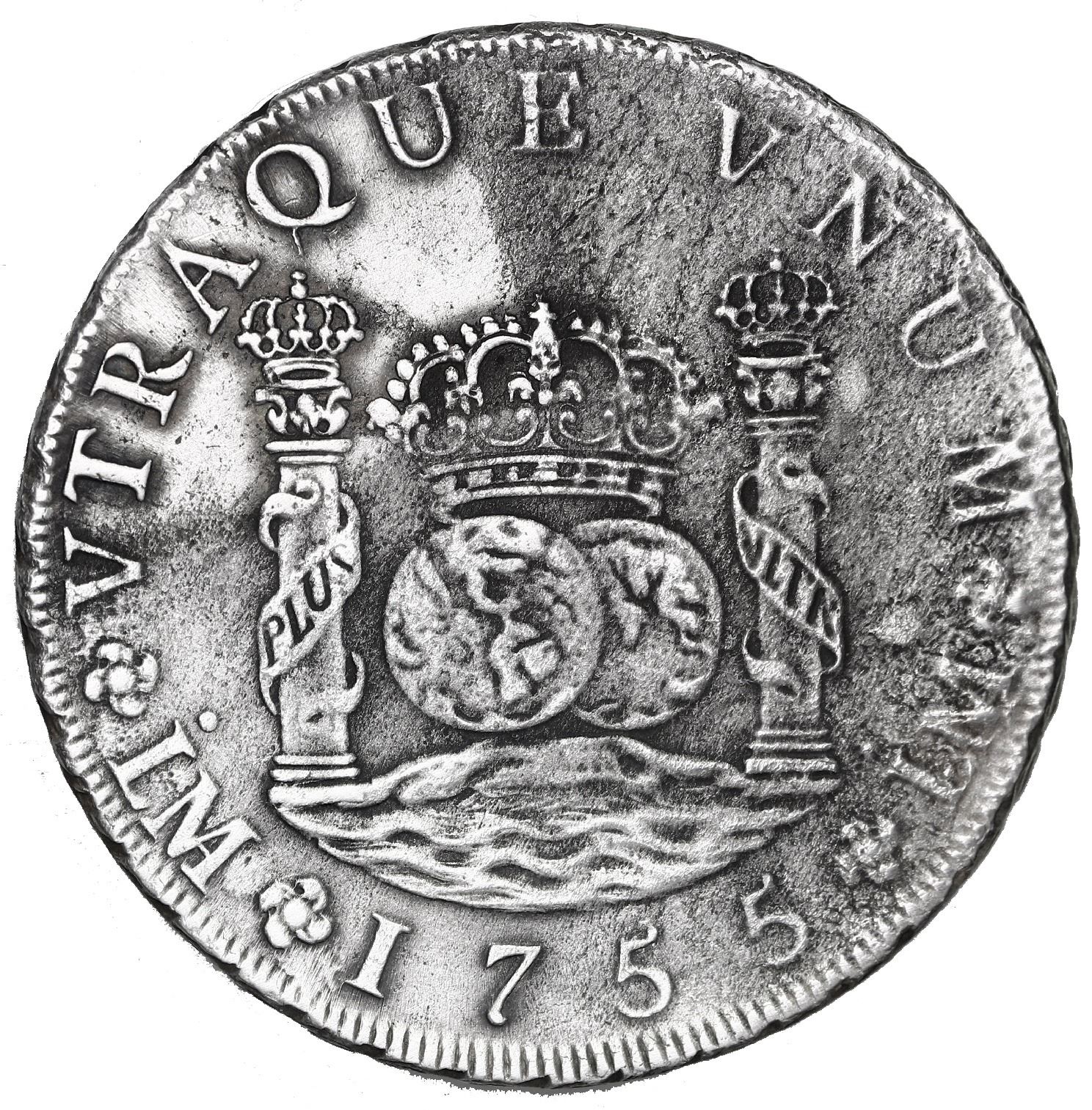 Lima, Peru, pillar 8 reales, Ferdinand VI, 1755 JD. Yonaka-L8.55; KM-55.1; Cal-459. 26.22 grams. UNC with mostly matte-etched surfaces (the rest lustrous), toned around details.