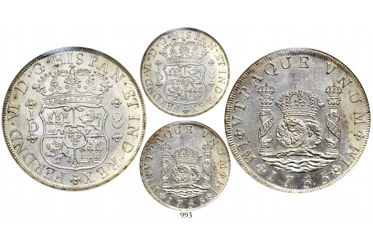 Lima, Peru, pillar 8 reales, Ferdinand VI, 1755JD, encapsulated NGC MS 60. KM-55.1; CT-312. Choice strike and luster, matte streaks near rims but otherwise flashy and impressive.