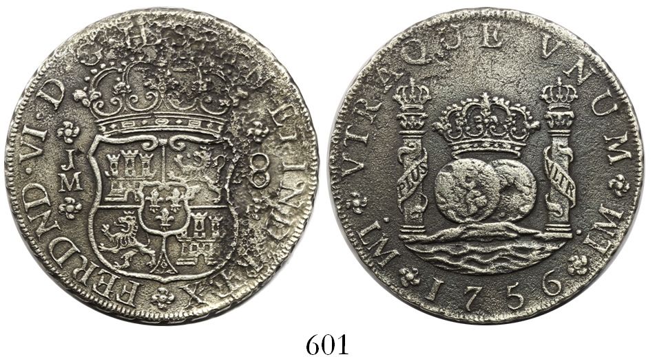 Lima, Peru, pillar 8 reales, Ferdinand VI, 1756JM, dots over both mintmarks. KM-55.1; CT-unl. 24.55 grams. AU- details with decent toning, areas of surface corrosion, re-punched 7 in date. Pedigreed to the Auguste Research Collection, with original certificate from the salvagers. Recovered from: Auguste, sunk in 1761 off Nova Scotia, Canada