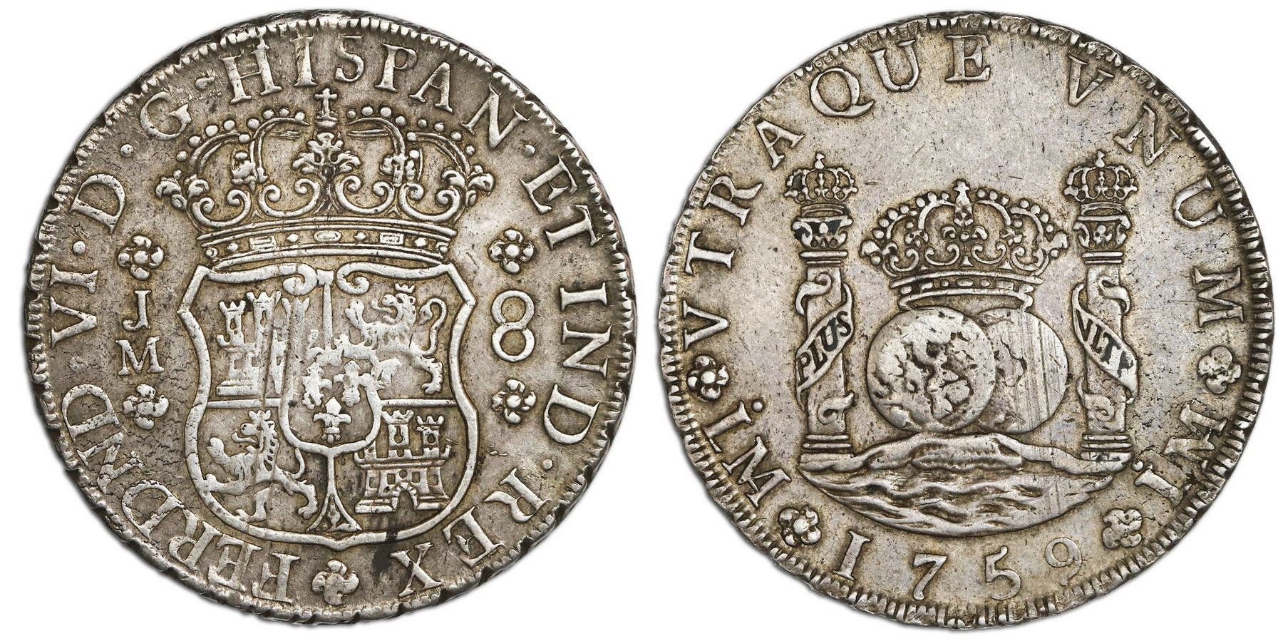 Lima, Peru, pillar 8 reales, Ferdinand VI, 1759JM, dot over both mintmarks. ,KM-55.1; CT-unl. 27.09 grams. Nicely toned XF+ with hints of original luster, faint adjustment marks on globes. Purchased from W.E. Kitson in 1971.
