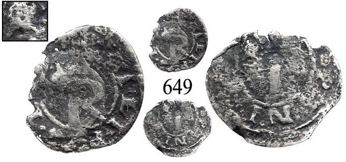 Lima, Peru, ¼ real, Philip II, assayer X/R, extremely rare (first specimen known). S-L2. 0.4 gram. A tiny but very rare issue made even rarer by the fact that the assayer-mark to the left of the crowned I shows over-assayer X/R, the first such specimen we have ever heard of. Like almost all specimens of this type, this coin is moderately corroded from salvage, but the central design (crowned R on one side and crowned I on the other, originally supposed to be K and I for Charles and Joanna) is all clear, and there is even some bold legend (net grade Fine). Probably from the Rimac River in Lima, Peru.