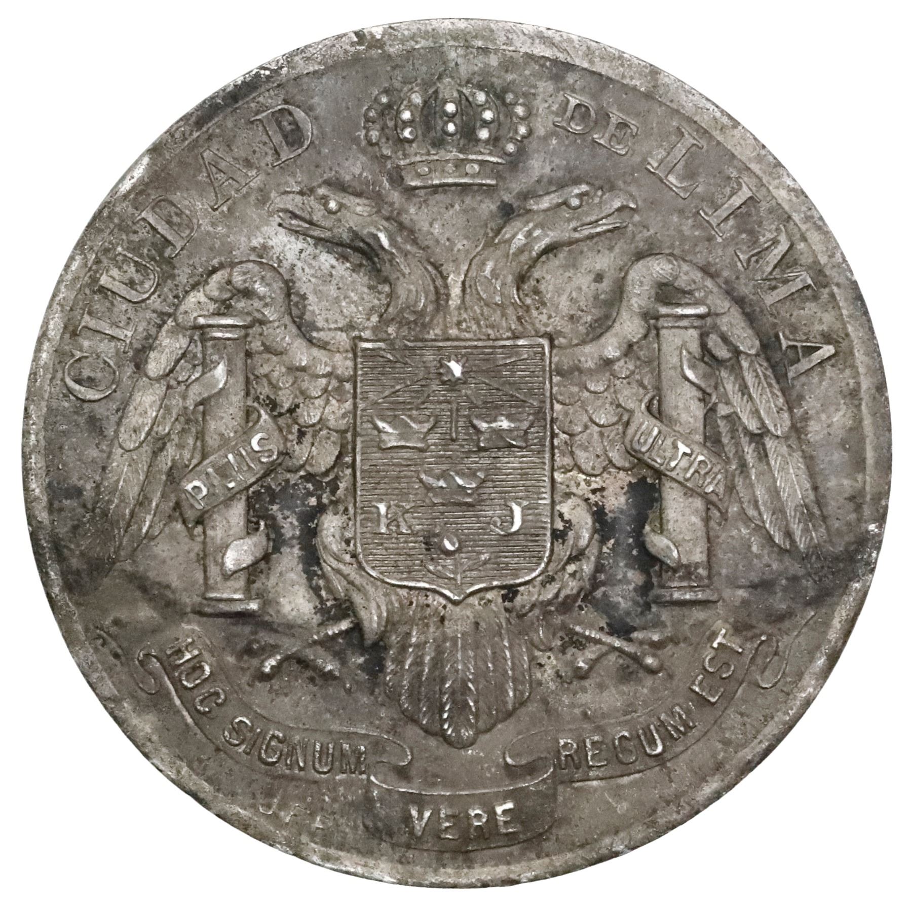 Lima, Peru, silver medal, 1906, placing of the cornerstone of the office of the hydroelectric company in Chacrasana (Lima) by U.S. Secretary of State Elihu Root. 11.77 grams. Obverse: high relief coat of arms of Lima at center with CIUDAD DE LIMA at top and HOC SIGNUM VERE REGUM EST in a banner below, initials JFR at 7 o'clock on rim; reverse: EMPRESAS ELECTRICAS ASOCIADAS above with date 1906 below, COLOCACION / DE LA 1a. / PIEDRA / DE LA / OFICINA / HIDRO-ELECTRICA / DE CHACRASANA / POR EL / H.S. / ELIHU ROOT at center; smooth edge. AU+ with mottled dark toning, lustrous reverse, interesting medal that we have not encountered before, apparently quite rare.