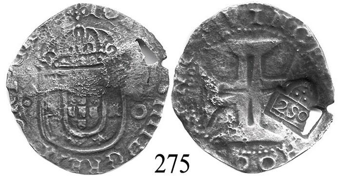 Lisbon, Portugal, 200 reis, John IV, with Brazilian 250-reis ("2S0") countermark (1663). 5.5 grams. Very bold, full and deep countermark that caused a void near the edge, also good shield despite some corrosion, bold legends with king's ordinal IIII, nicely toned. Recovered from: Sacramento, sunk in 1668 off the Bay of All Saints, Bahia, Brazil.