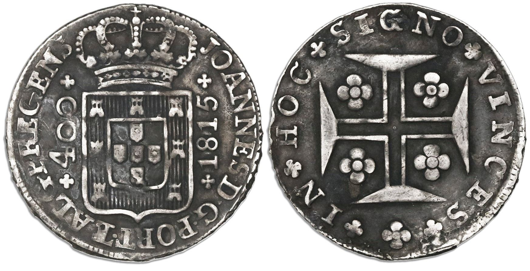 Lisbon, Portugal, 400 reis, 1815. KM-331. 12.17 grams. Bold VF+ details enhanced by deep toning all over, no corrosion. Recovered from: Unidentified mid-1800s wreck in the English Channel