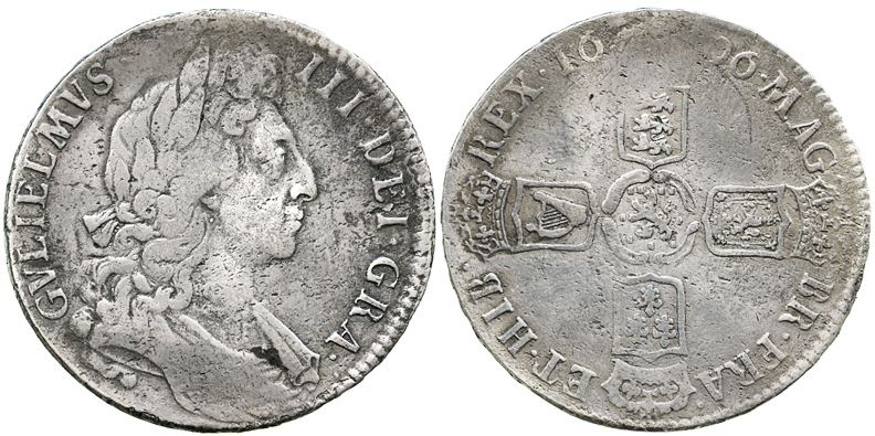 London, England, 1/2 crown, William III, 1696, small shields. Sp-3475; KM-491.13. 14.2 grams. Solid and uncorroded, with full details, lightly toned but somewhat polished. With certificate #17650 from the salvagers. Recovered from: Association, sunk in 1707 off the Scilly Isles, southwest of England