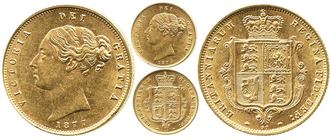 London, England, 1/2 sovereign, Victoria (young head), 1877, die 97. KM-735.2; Sp-3860D. 4.0 grams. Lustrous Mint State with minor rim-bruises.