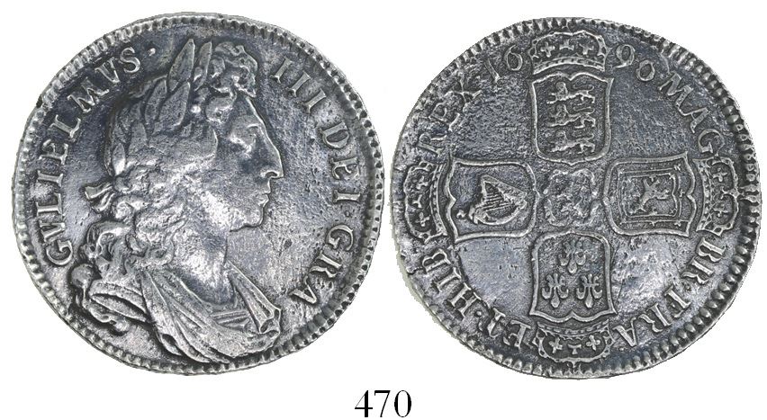 London, England, half crown, William III, 1696, first bust, large shields, early harp.