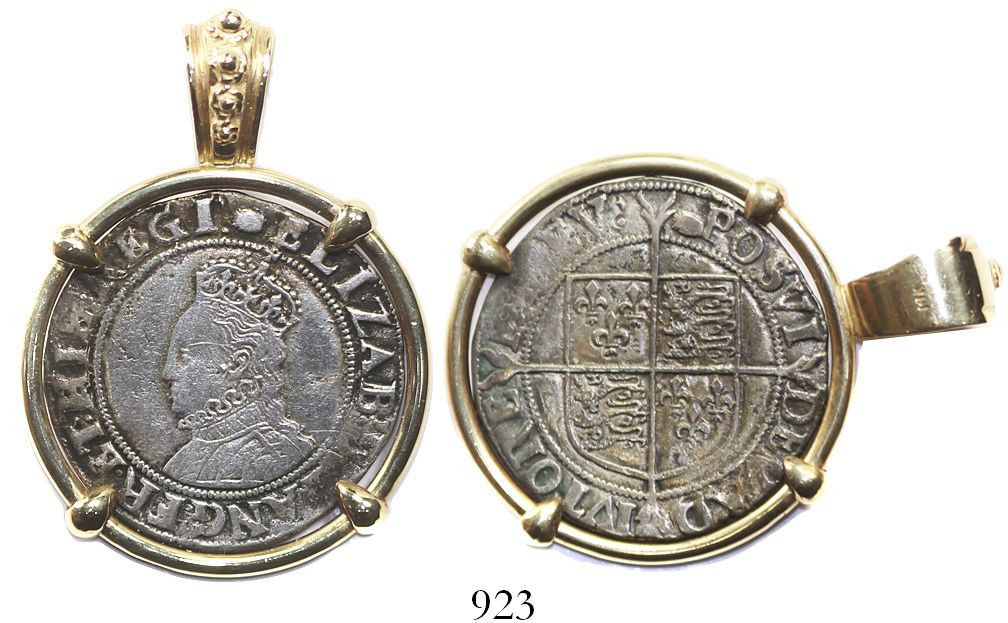 London, England, shilling, Elizabeth I, fifth issue, mintmark tun (1591-5), mounted in 14K gold pendant-bezel. Sp-2577 17.15 grams total. Attractively rainbow-toned VF with a few old marks, good details.