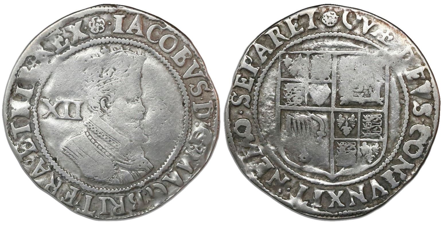 London, England, shilling, James I (third bust), mintmark Tudor rose (1605-6).