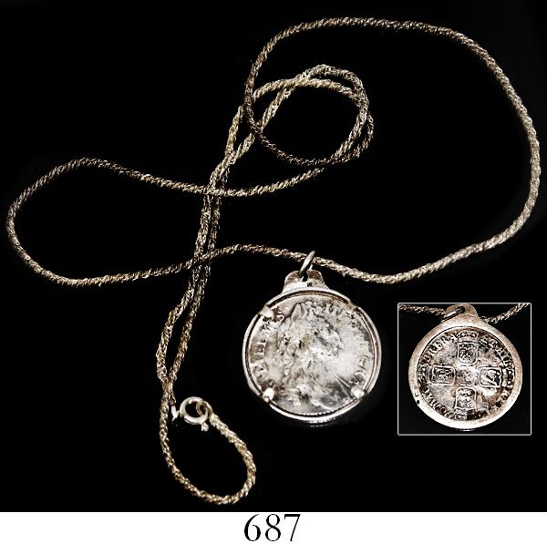 London, England, shilling, William III, 1696, mounted in sterling silver bezel with wire chain. Sp-3497. 16.8 grams total, the chain 11-1/2" long. Largely uncorroded but somewhat pockmarked Fine with black spots and slight wrinkling, the bezel and chain very simple. With generic certificate from the salvagers. Recovered from: Association, sunk in 1707 off the Scilly Isles, southwest of England