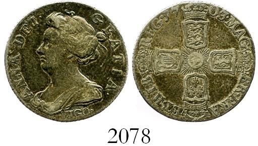 London, England, sixpence, Anne, 1703, with VIGO below bust. Sp-3590. 3.0 grams. Richly toned VF, popular as struck from silver captured from the Spanish at Vigo Bay.