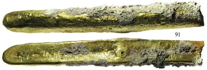Long, coral-encrusted gold bar #43, 17¼K, one end cut, from the "Golden Fleece wreck" (ca. 1550).