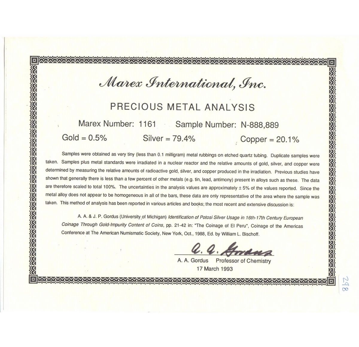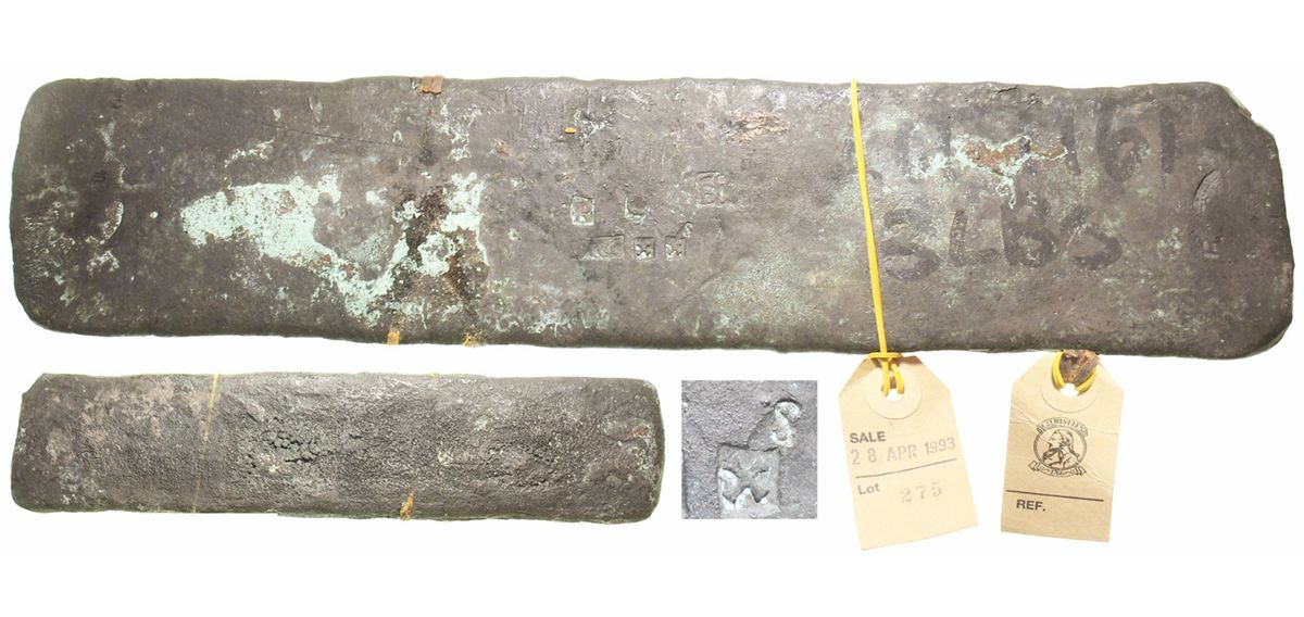 Long, thin, flat "tumbaga" silver bar #1161, 3 lb 1 oz av, marked with assayer/owner B~Vo, serial RC and fineness, rare as uncleaned. 13" x 2-3/4" x 3/8". Before Douglas Armstrong was hired to conserve the bulk of the "tumbaga" bars from this wreck, a handful were taken to the University of Michigan's Dr. Adon A. Gordus for chemical analysis, which proved the bars were silver but showed skewed results due to the fact that the bars had not been cleaned yet. Those bars were then sold in the Christie's (London) auction of 1993, still uncleaned, and disappeared to the four corners of the earth (which is why they are not in Armstrong's book). The present lot is one of those bars sold in 1993, a very thin bar with frosty green encrustation gracing dark, almost copper surfaces, the clear markings all on one side, including fineness IUCCCCxx (1420/2400 = 59.2% fine) with a little S extending diagonally (first time we've seen that), partial round tax stamps at either end, with one corner cut away for the assayer's "bite." From the "Tumbaga wreck" (ca. 1528), and pedigreed to the Christie's (London) auction of April 28, 1993, with original lot-tag #275 and with original Gordus assay report from 1993.