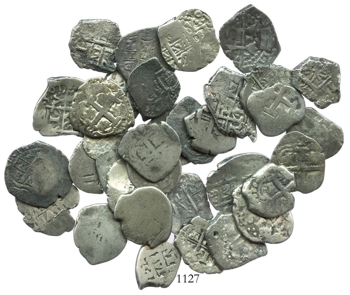 Lot 35 Potosi, Bolivia (and some Lima, Peru) cob 1R, various periods, some with visible dates. 96.3 grams total. Grades in this lot range from Good to AVF, with at least some identifying detail on each one (dates and assayers), some decent crosses, just a few with corrosion or holes, mostly nicely toned, good wholesale lot for jewelers. Pedigreed to the Mark Bir collection.