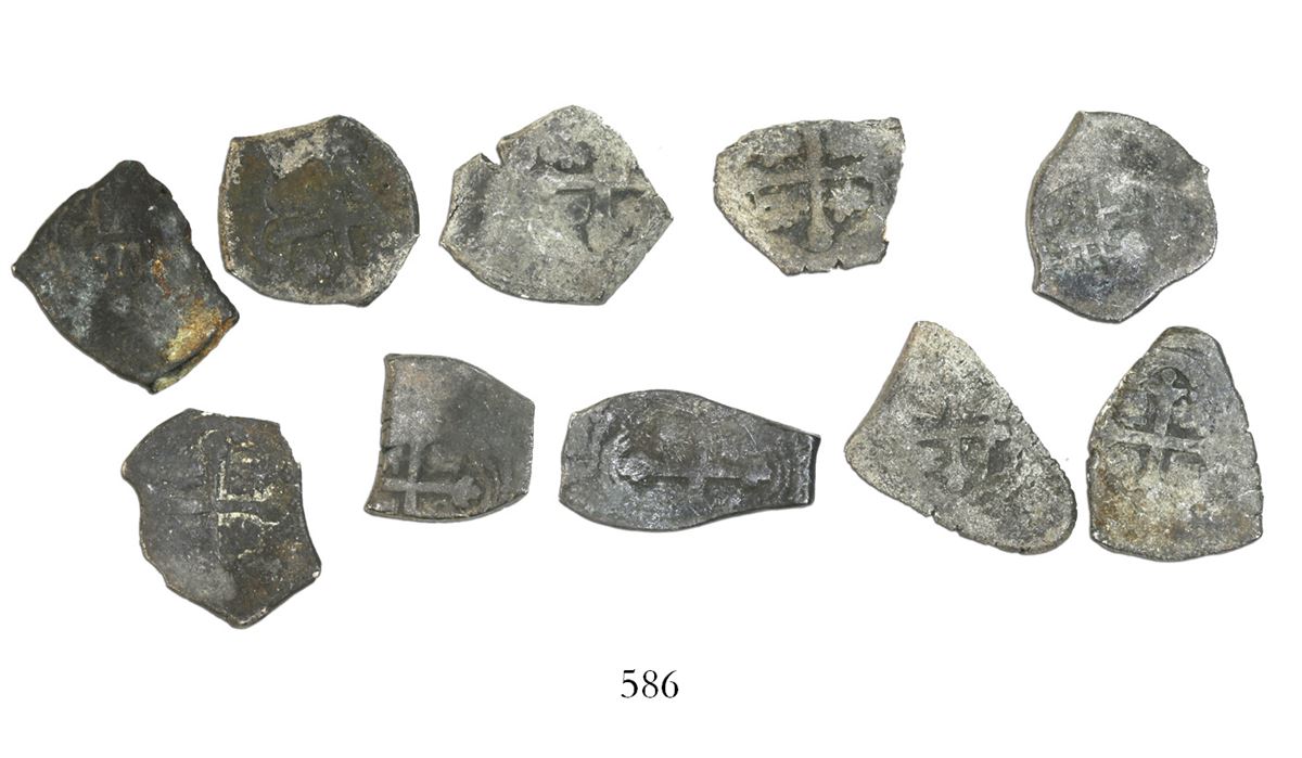 Lot of 10 Mexico City, Mexico, cob 1 reales, Charles II and Philip V, various assayers (where visible), uncleaned (as found), with hand-signed Fisher certificates. 29.62 grams total. Solid coins with generally nice crosses and shields, little or no corrosion, mostly intact surfaces, very nice group of untouched Fleet cobs. With small, hand-signed Fisher certificates. Recovered from: Spanish 1715 Fleet, east coast of Florida