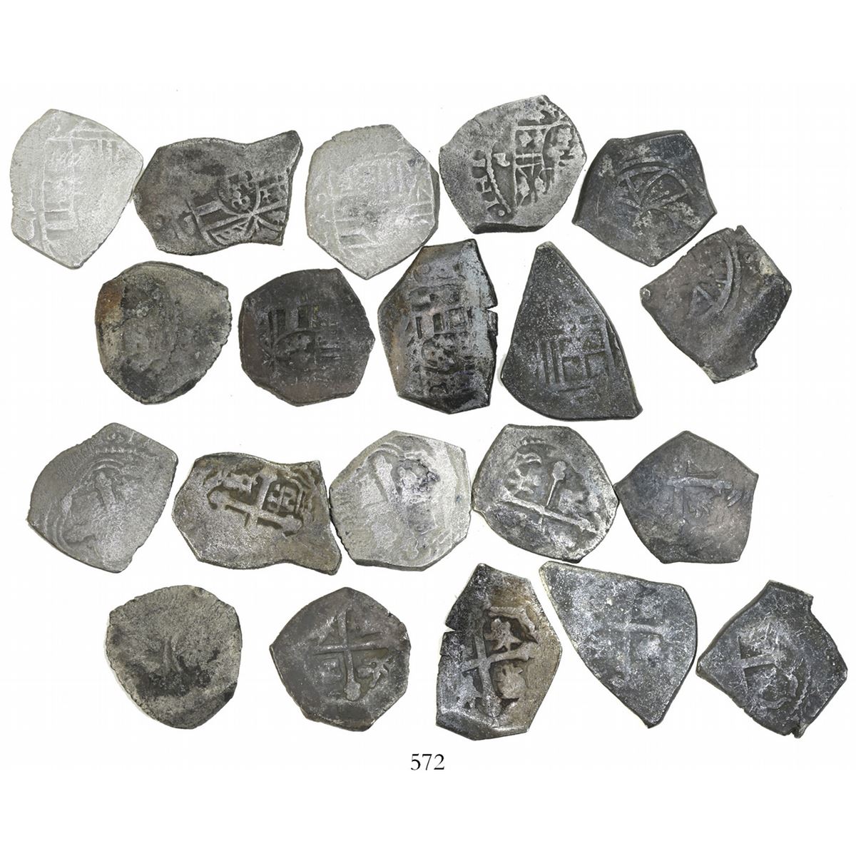 Lot of 10 Mexico City, Mexico, cob 2 reales, Charles II and Philip V, various assayers (where visible), several uncleaned (as found). 59.65 grams total. All nicer specimens, solid coins with generally good crosses and shields, little or no corrosion, mostly intact surfaces. With generic Cobb Coin Co. (Fisher) certificates. Recovered from: Spanish 1715 Fleet, east coast of Florida