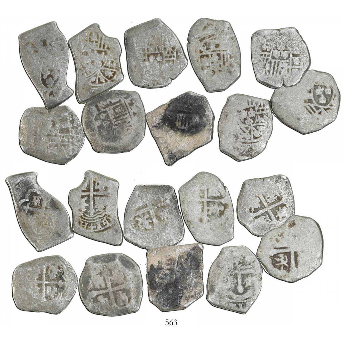 Lot of 10 Mexico City, Mexico, cob 4 reales, Philip V, assayer J (where visible), with hand-signed Fisher certificates. 110.80 grams total. Generally good shields and crosses, light wear and corrosion but most with contrasting sediment in crevices. With small, hand-signed Fisher certificates from the late 1960s or early 1970s. Recovered from: Spanish 1715 Fleet, east coast of Florida