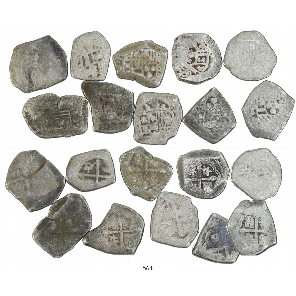 Lot of 10 Mexico City, Mexico, cob 4 reales, Philip V, assayer J (where visible), with hand-signed Fisher certificates. 116.70 grams total. Generally good shields and crosses, light wear and corrosion but most with contrasting sediment in crevices. With small, hand-signed Fisher certificates from the late 1960s or early 1970s. Recovered from: Spanish 1715 Fleet, east coast of Florida