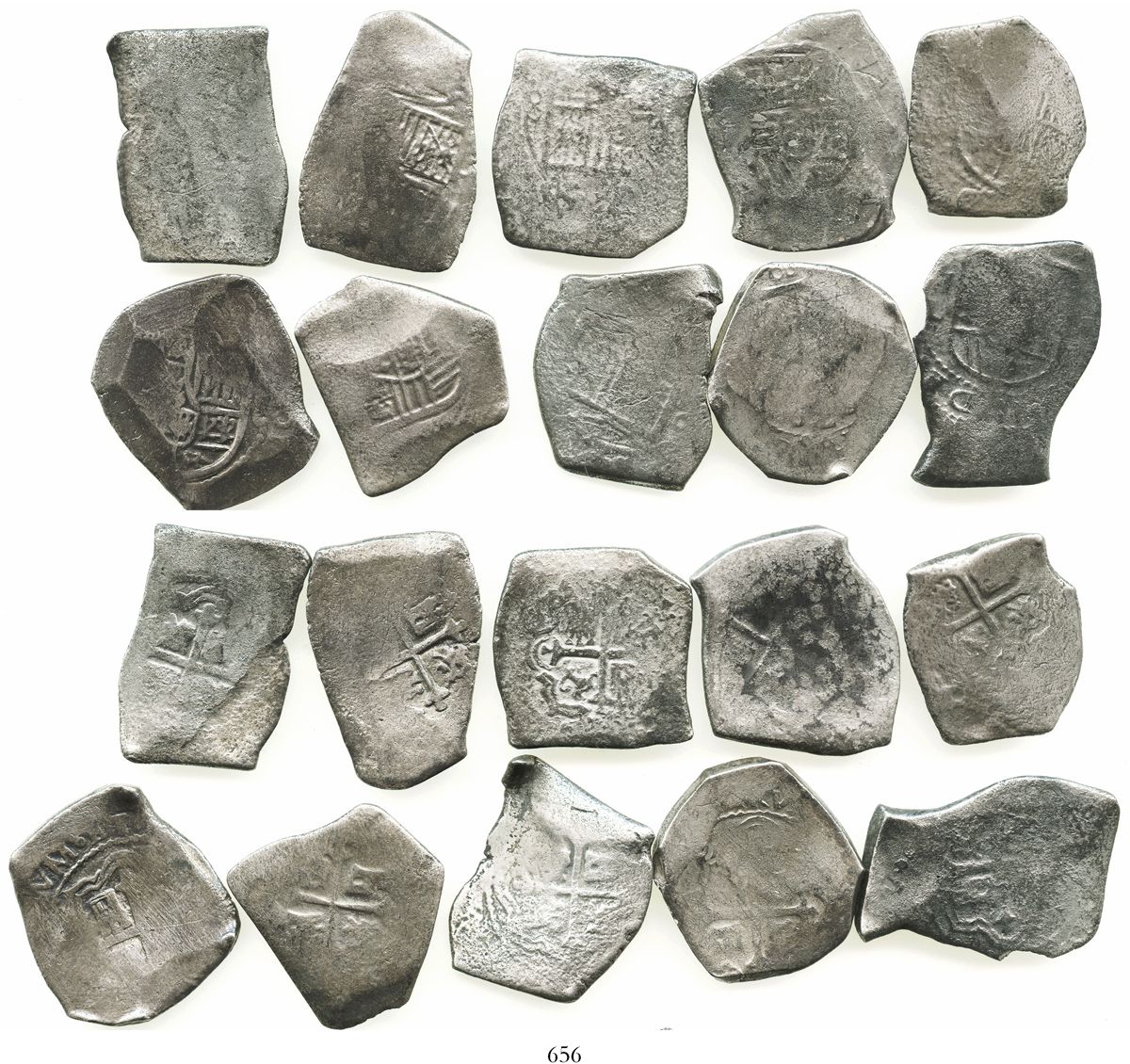 Lot of 10 Mexico City, Mexico, cob 8 reales, Charles II, assayers not visible. KM-46. 210.0 grams total. Typically crudely struck (much flatness) and most thin from corrosion but all with at least some details and a few interesting shapes. Recovered from: Joanna, sunk in 1682 off South Africa
