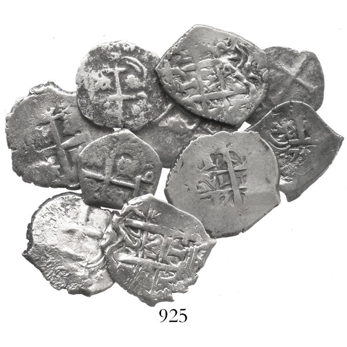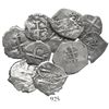Lot of 10 Potosi, Bolivia, cob 1 reales, Philip V, all with visible dates. 30.0 grams. Decent coins with dates from 1706 to 1739 (none rare), some with multiple dates, only a couple salvaged, the rest F-VF, nice group for jewelry or the beginning collector.