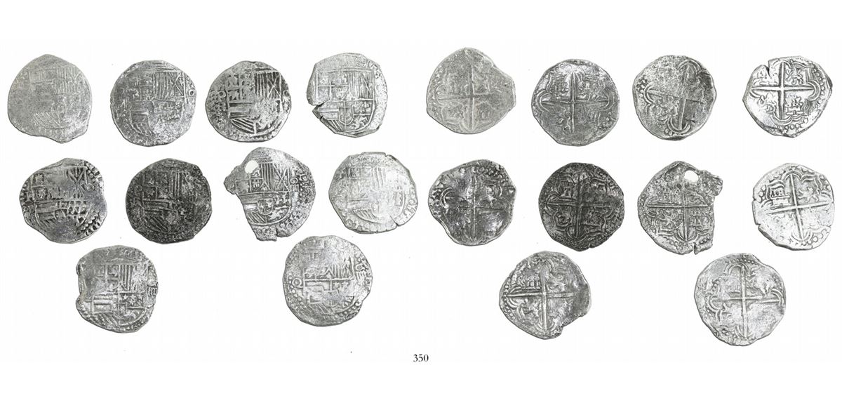 Lot of 10 Potosi, Bolivia, cob 4 reales, Philip II and/or III, various assayers (where visible), all Grade 2. Generally lightly corroded (some better, some worse) with good shields and crosses, some with visible assayers. With Fisher certificates #118244, 119610, 129390, 129519, 129637, 140715, 141256, 147133, 147495 and 152564. Recovered from: Atocha, sunk in 1622 west of Key West, Florida