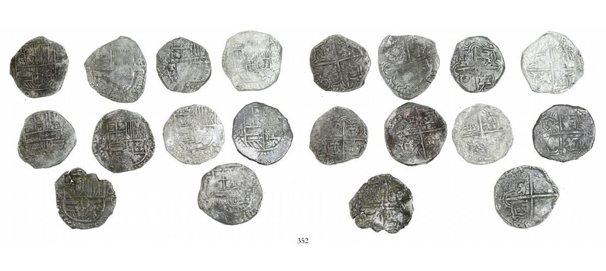 Lot of 10 Potosi, Bolivia, cob 4 reales, Philip II and/or III, various assayers (where visible), all Grade 2. Generally lightly corroded (some better, some worse) with good shields and crosses, some with visible assayers. With Fisher certificates #161157, 161331, 161962, 162116, 163701, 164358, 164444, 167859, 170711 and 172443. Recovered from: Atocha, sunk in 1622 west of Key West, Florida