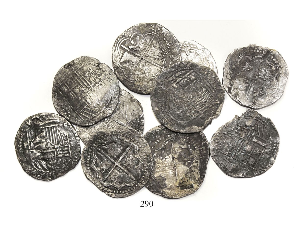 Lot of 10 Potosi, Bolivia, cob 4 reales, Philip II, assayer B (various periods). KM-4.2. 124.95 grams total. Mostly solid coins with clear details despite moderate to heavy corrosion and "chewing" around edges, light toning. Recovered from: Unidentified ca.-1590 wreck off the Yucatán peninsula of Mexico