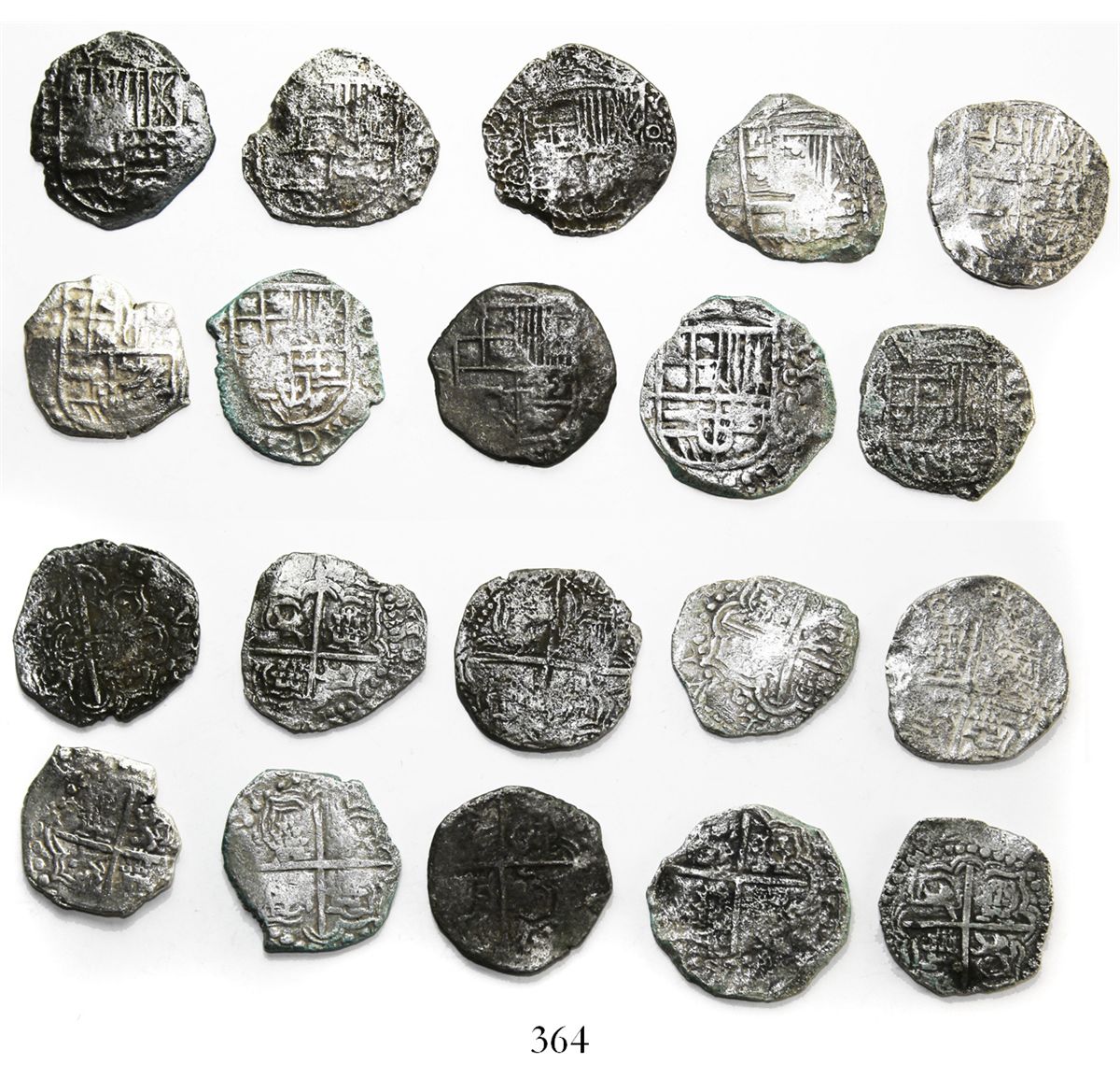 Lot of 10 Potosi, Bolivia, cob 4 reales, Philip III, assayers not visible, all Grade-2 quality but no Grades on the certificates. KM-9. 113.81 grams total. Light to moderate corrosion, generally good crosses and shields. With Fisher certificates #114665, 121258, 125595, 128155, 128257, 144939, 160630, 163698, 173290 and 174391. Recovered from: Atocha, sunk in 1622 west of Key West, Florida