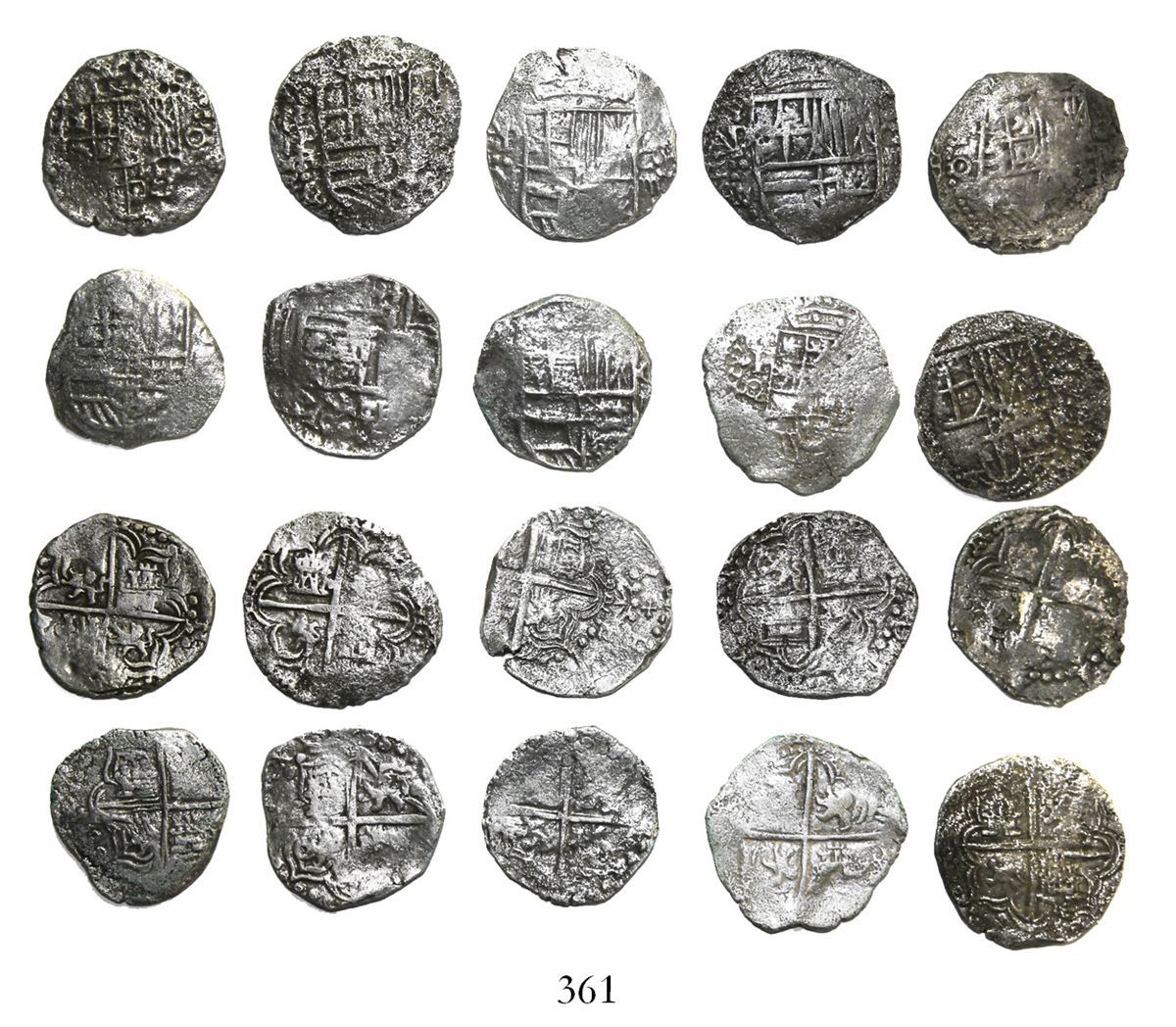 Lot of 10 Potosi, Bolivia, cob 4 reales, Philip III, various assayers (where visible), all Grade 2. KM-9. 115.76 grams total. Light to moderate corrosion, generally good crosses and shields. With Fisher certificates #154519, 154638, 155599, 156110, 156709, 159783, 161151, 162110, 174388 and 176252. Recovered from: Atocha, sunk in 1622 west of Key West, Florida
