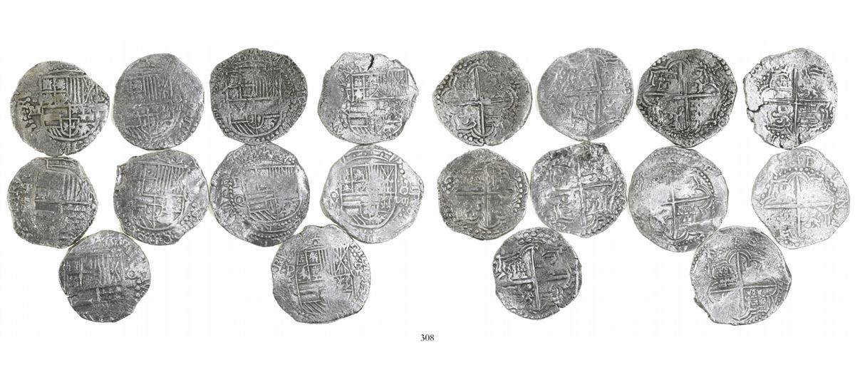 Lot of 10 Potosi, Bolivia, cob 8 reales, Philip II and/or III, various assayers (where visible), all Grade 1. Generally good shields and crosses, most corrosion-free or close to it, most with visible assayers. With Fisher certificates #155331, 155399, 156393, 156827, 156850, 157247, 157998, 158380, 158703 and 159015. Recovered from: Atocha, sunk in 1622 west of Key West, Florida